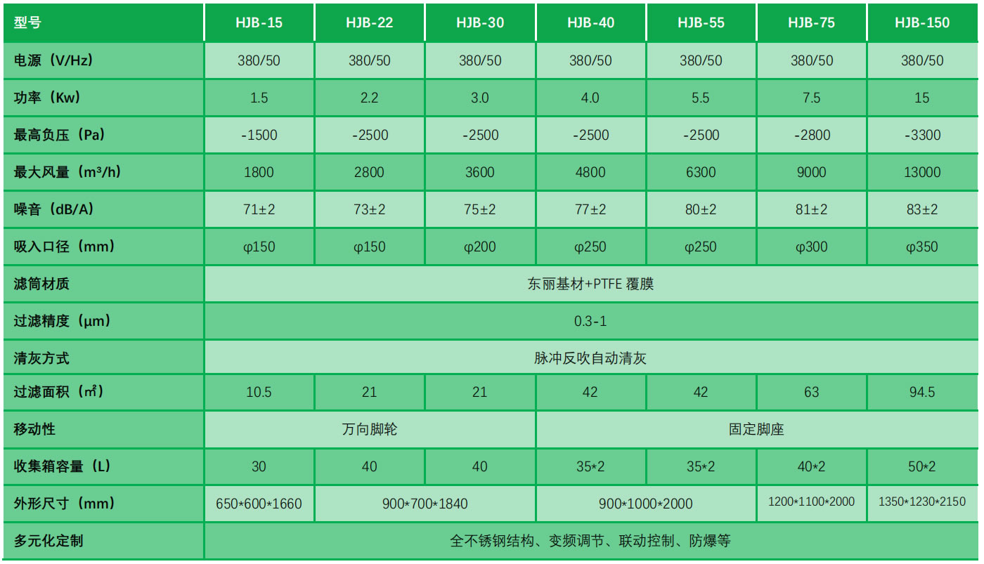 HJB系列產品以柜式結構、大風量、為特點,采用一體化柜式結構,外形美觀,專為漂浮、懸浮粉塵收集與治理,適用于攪拌作業、切削作業、袋裝作業、研磨作業、噴砂作業、有機玻璃加工、震動篩網、空氣輸送、包裝作業等的粉塵收集而設計,與主機完美融合。