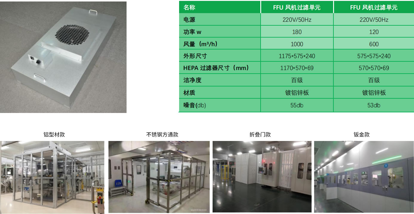 3、風機濾網機組FFU:采用離心風機,具有長壽命、低噪聲、免維護、震動小、可級變速等特性,風機質量可靠,工作壽命長,加上獨特的風道設計,大大提高了風機的效率、降低了噪聲!內部凈化級別可達100-100K級;
